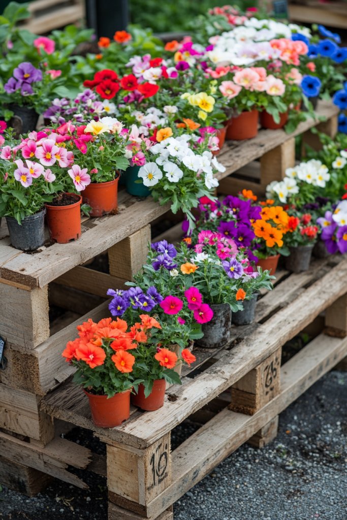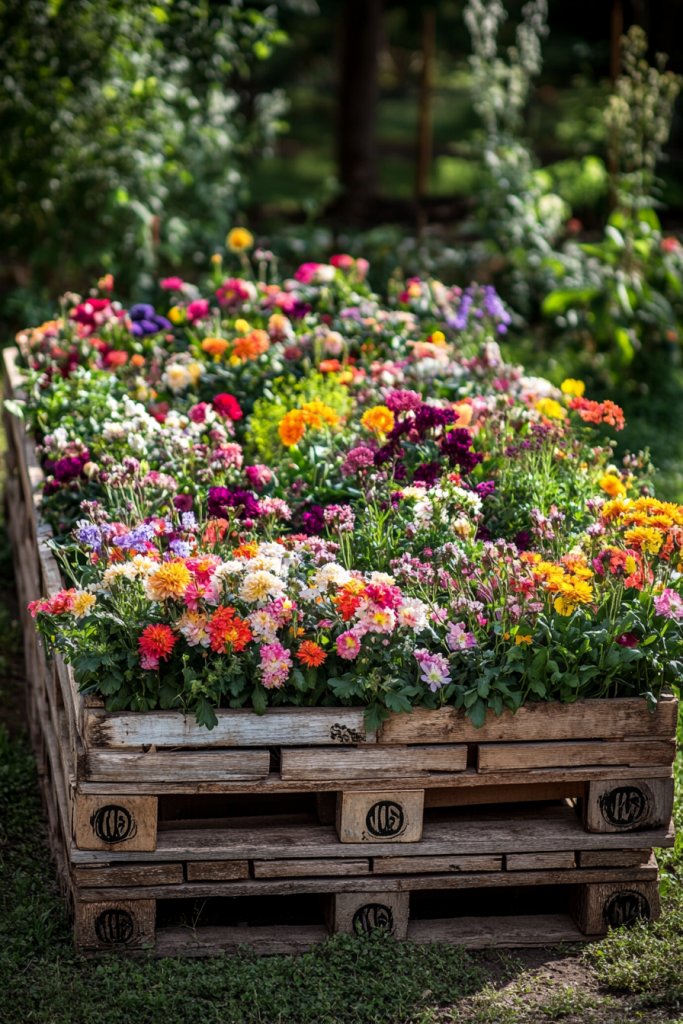Plus, it keeps soil contained and weeds at bay, making gardening more manageable. Picture a flat laid pallet, filled with rich dark soil, bursting with colorful petunias, marigolds, and daisies.