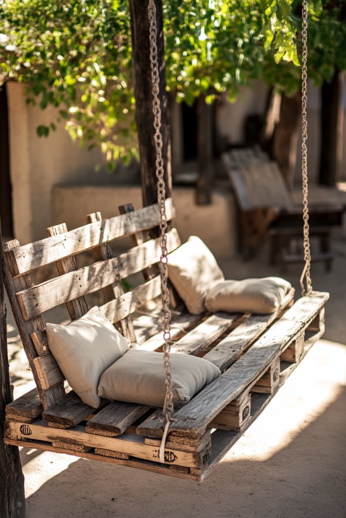 Add small side tables or footrests made from pallets for convenience. Surround the swing with potted plants or rustic decor to enhance the ambiance.