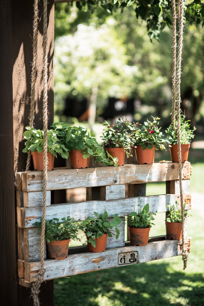 Looking for a space-efficient way to display plants without cluttering your yard or balcony? A hanging pallet planter with rope support provides a rustic, minimalist solution that adds visual interest. It’s perfect for small spaces or creating a vertical garden that’s both functional and decorative.