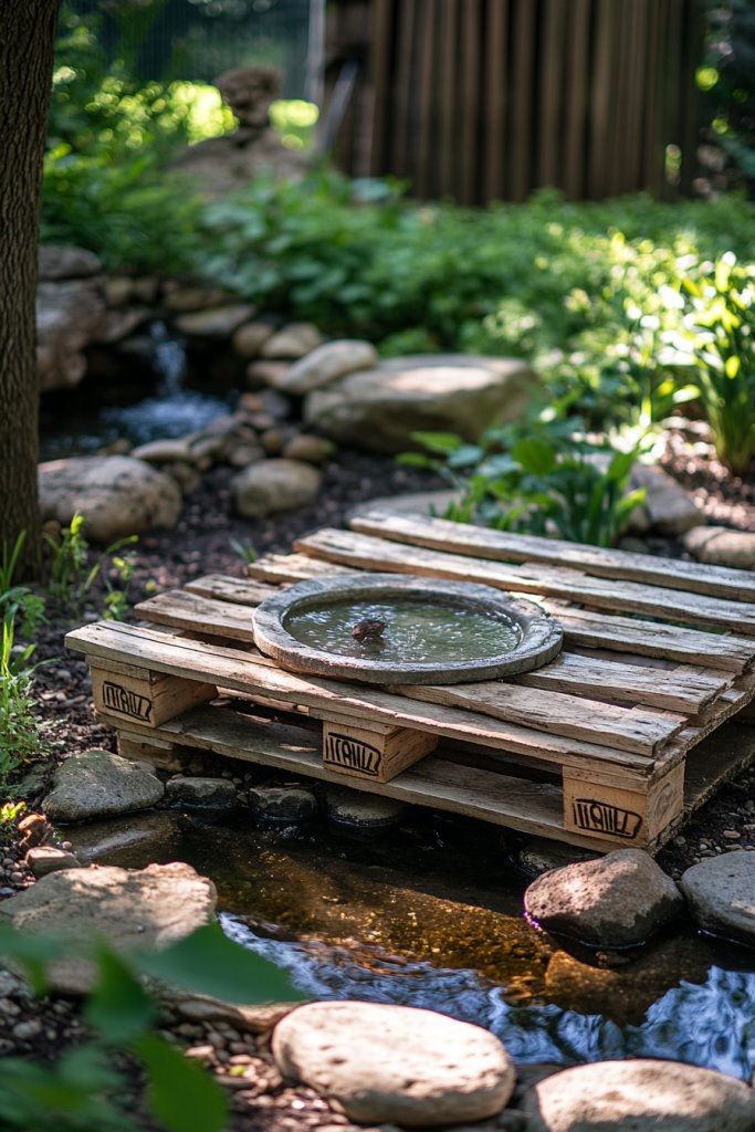It’s a peaceful, lively scene that emphasizes harmony with nature. Paint or stain the pallet in earthy tones to blend seamlessly with your garden.