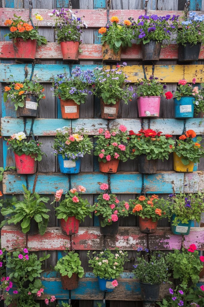 The overall effect is inviting and lively, perfect for a backyard or a cottage garden. Paint the pallet in bright, cheerful colors for a playful look or leave it natural for a more traditional, rustic appeal.