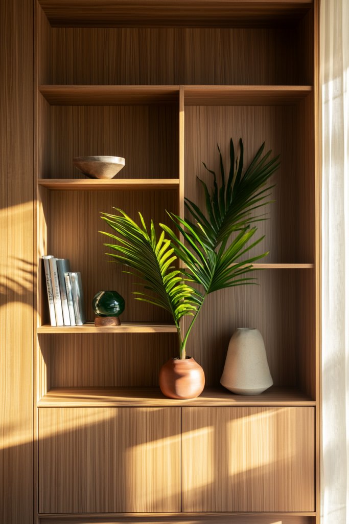 Light woods can soften the look, while darker finishes can provide a bold statement. You can also play with varying shelf heights and widths to create visual interest.