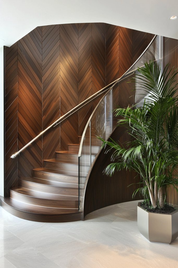 You can play with texture, color, and pattern to create a dramatic visual impact. For instance, consider using vertical panels to draw the eye upward, making the staircase feel grander.