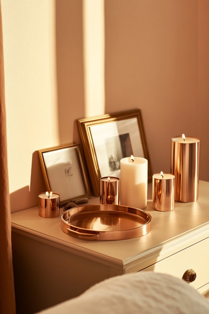 Imagine a bedside tray or decorative hardware in rose gold paired with peach bedding. The warm metallic sheen catches the light softly, adding depth and richness. Incorporate these accents in picture frames, mirror trims, or drawer pulls to subtly elevate the room’s elegance. The combination feels modern yet timeless.