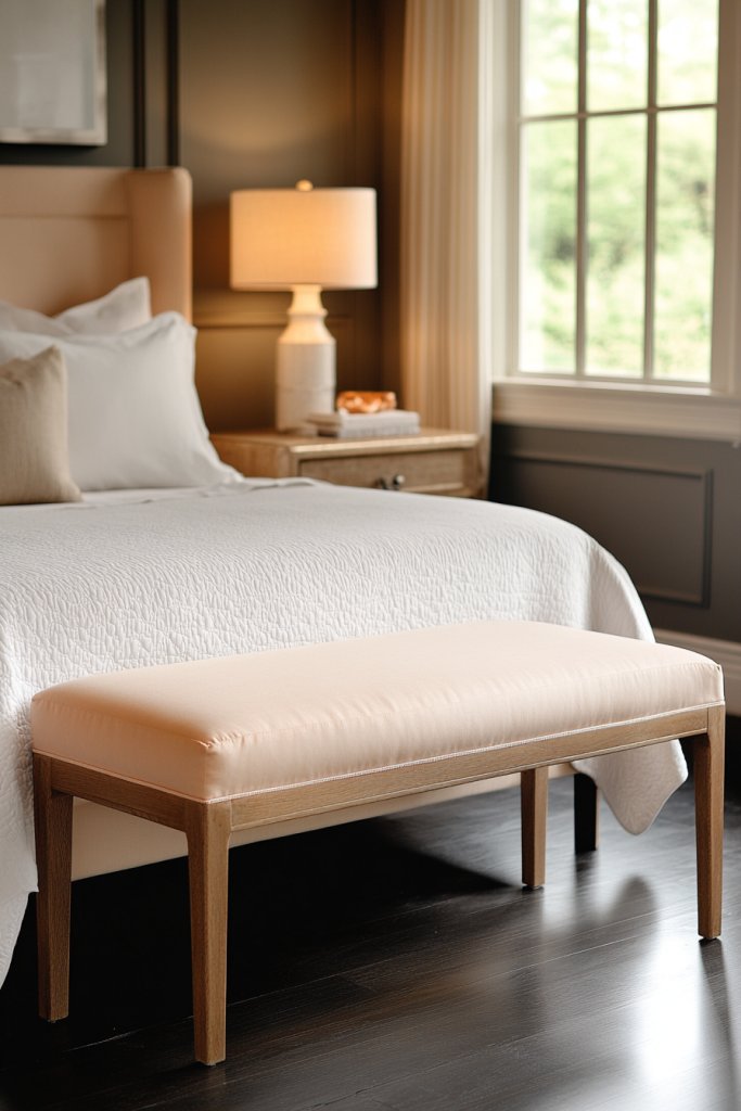 11. Light Peach Upholstered Bench at the Foot of the Bed for Functionality