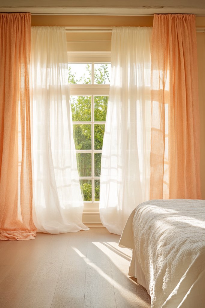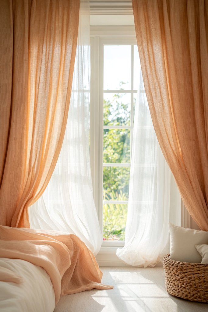 5. Peach-toned Drapes with Sheer White Layers for Soft Natural Light