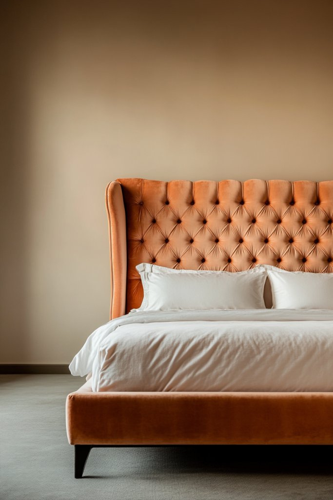 Picture a plush peach velvet bed frame with a tufted headboard that invites you to sink in. The soft fabric catches the light with a subtle sheen, adding depth and richness. Paired with crisp white linens and textured throws, it becomes the statement piece in your room. The cozy, inviting feel makes it irresistible to crawl into at night.