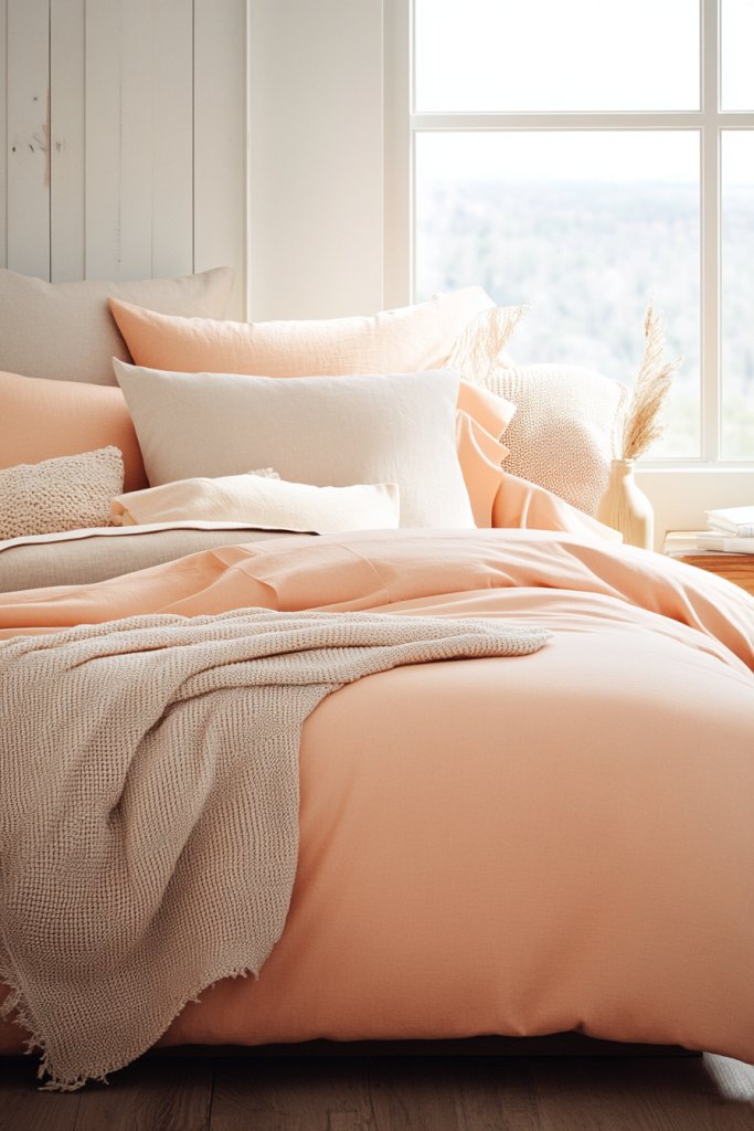 Envision crisp white sheets topped with a soft peach duvet cover. Add a neutral throw in beige or light gray, textured with subtle quilting or knitting. Decorate with pillows in varying shades of peach and cream, mixing smooth satin and textured knits. The layered look combines comfort with visual depth, making your bed look plush yet effortless.