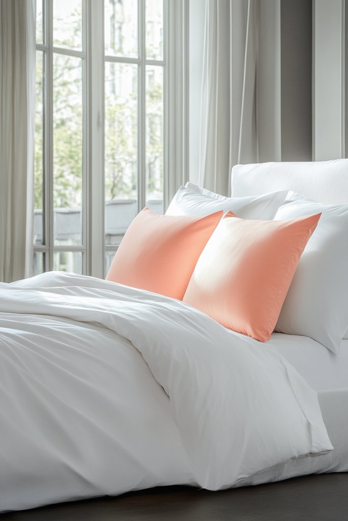 4. Minimalist Peach Accent Pillows on a White Bed for Freshness
