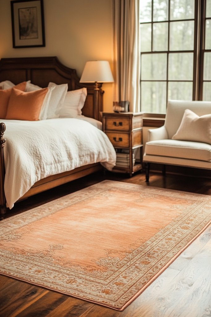 A peach area rug grounds your bedroom design, making it feel complete and polished. It adds warmth and softness, transforming the space into a cozy retreat. Once you see how a rug can uplift the whole room, you’ll wonder why you didn’t do it sooner.