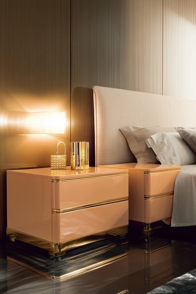 Imagine sleek peach nightstands with gold hardware, like drawer pulls and trim. The warm peach finish combines beautifully with shiny gold accents, creating a luxe vibe. Placed beside a simple bed, they add elegance and serve as a stylish focal point. Ambient lighting from nearby sconces or candles enhances the gold’s glow.