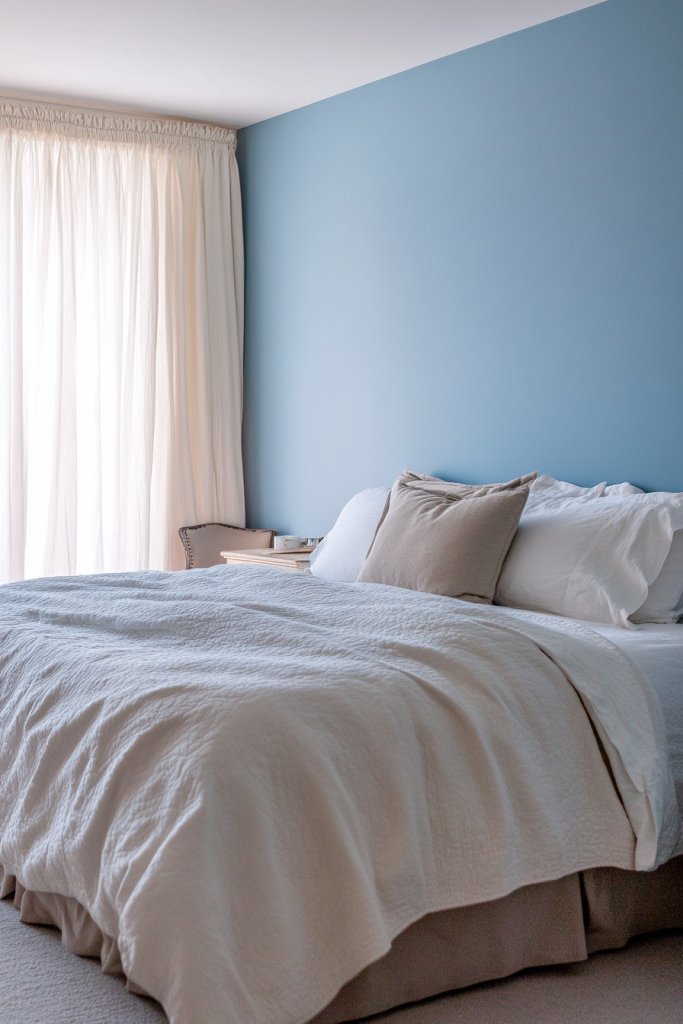 Imagine a soft, muted peacock blue wall behind your bed, catching the gentle glow of sunset light. It’s like having a calm sky indoors, with subtle hints of teal and navy blending seamlessly. The textured white bedding contrasts perfectly, creating a crisp, clean look that’s both cozy and sophisticated. Natural light filters through sheer curtains, enhancing the tranquil vibe without any harsh shadows.