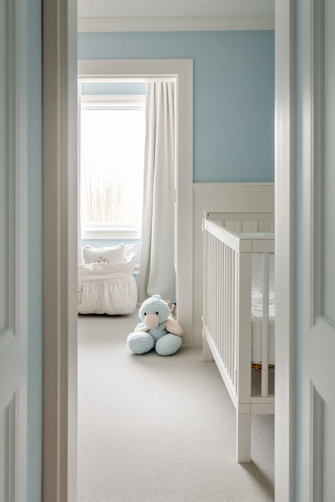This look works with minimalist decor, emphasizing natural materials and soft shades. During different seasons, layer with cozy blankets or breathable linens. Use neutral-colored rugs and furniture to keep the focus on the calming blue walls. As the child grows, you can adapt the decor with playful accessories or educational elements that keep the space fresh.