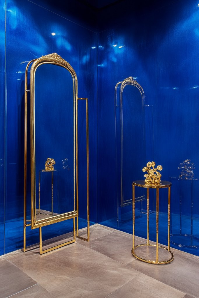 Picture a peacock blue accent wall with gold trim or decorative moldings shimmering in the light. Metallic gold fixtures, like handles or decorative brackets, add a touch of opulence. The matte blue backdrop makes the gold pop, creating a regal, elegant atmosphere. Textured fabrics in velvet or silk further enhance the plush, luxe vibe.