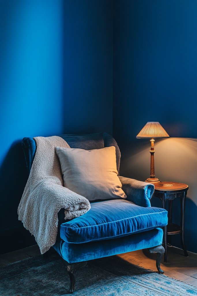 Picture a small alcove with peacock blue walls enveloping you in tranquility. A plush armchair or chaise lounge in neutral or warm tones invites you to sink in. Soft cushions and a textured throw blanket add layers of comfort. Gentle lighting from a nearby wall sconce or a small table lamp completes the cozy atmosphere, making it your perfect escape.