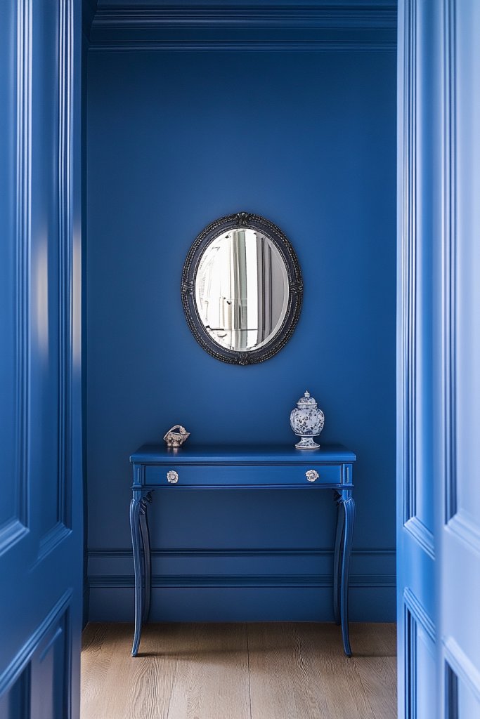 Imagine stepping into a foyer where the walls are painted in a muted peacock blue, complemented by a simple, elegant console table in warm wood. Soft, layered lighting highlights the rich hue without overpowering the space. The overall effect is calm and sophisticated, with just enough color to spark curiosity. A textured runner or patterned wallpaper on adjacent walls can add subtle interest.