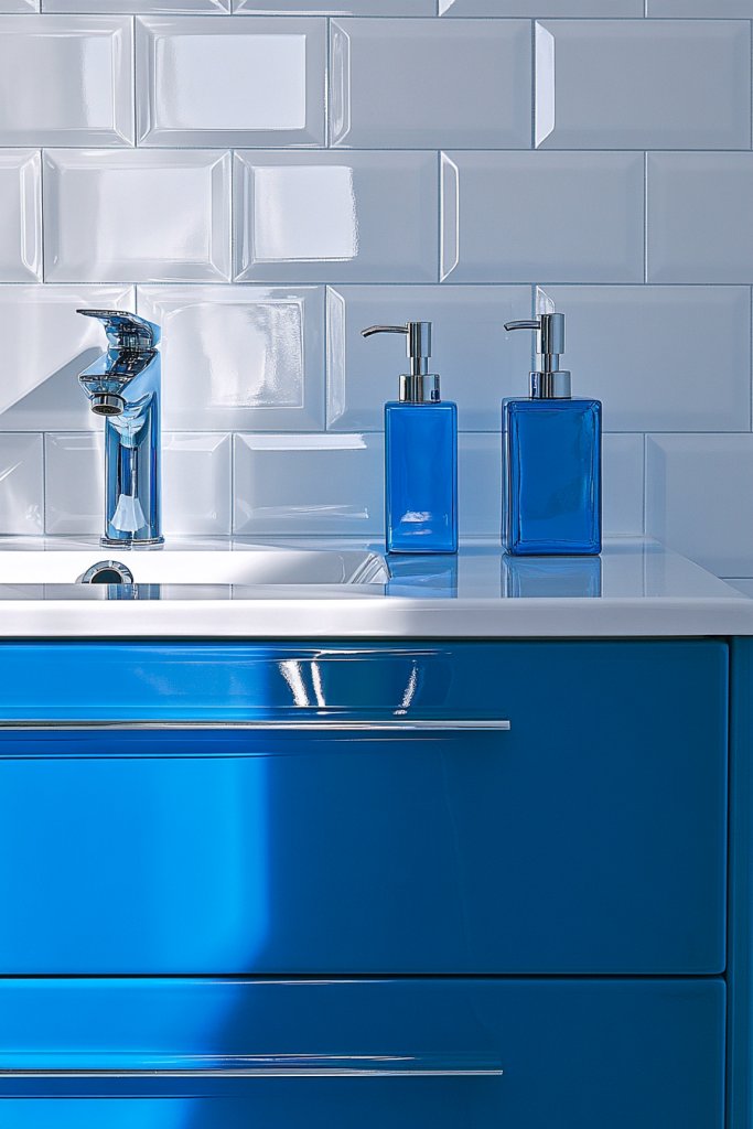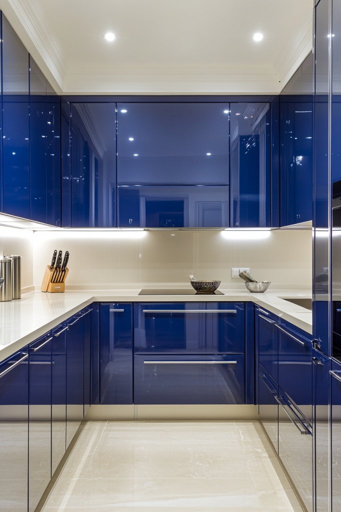 Picture sleek, high-gloss peacock blue cabinets reflecting light from under-cabinet LEDs, creating a luminous, inviting space. The deep teal undertones add richness, while the shiny finish catches every flicker of natural daylight. Paired with minimalist hardware and soft gray countertops, the kitchen exudes modern sophistication. The glossy surface amplifies the space, making it feel brighter and more open.