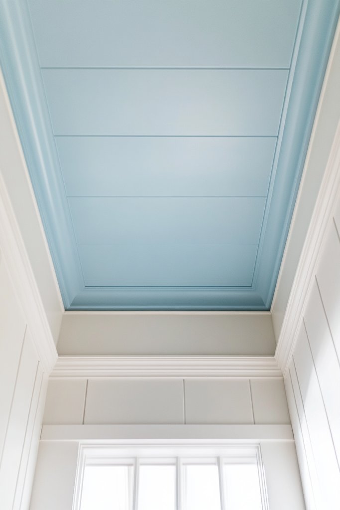 Complement the ceiling color with soft, layered lighting, such as wall sconces or indirect lighting, to accentuate the hue. Keep the rest of the decor light and airy to enhance the calming effect. Add textured ceiling medallions or decorative crown molding painted in a neutral shade for a touch of elegance. Personalize with subtle accessories that resonate with the sky-inspired theme.