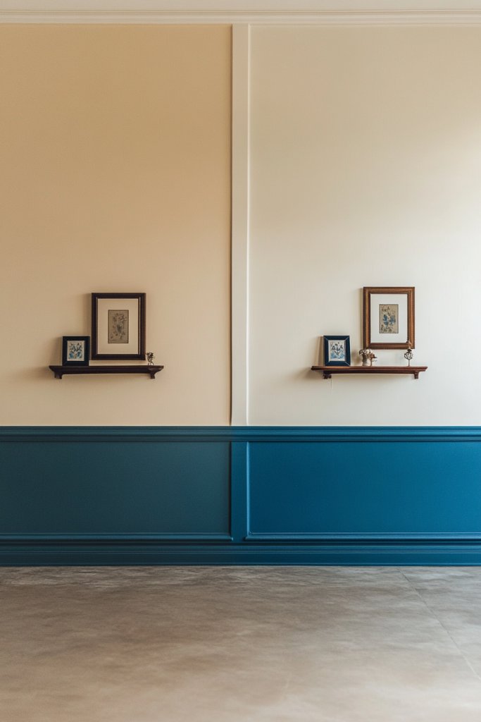 Imagine a room where the lower half of the wall is painted in rich peacock blue, while the upper part is a warm, soft cream. The two shades meet at a crisp, clean line, adding visual interest without clutter. The darker blue grounds the space, making it feel cozy, while the cream keeps it light and airy. This combination works perfectly in bedrooms, dining rooms, or even hallways.