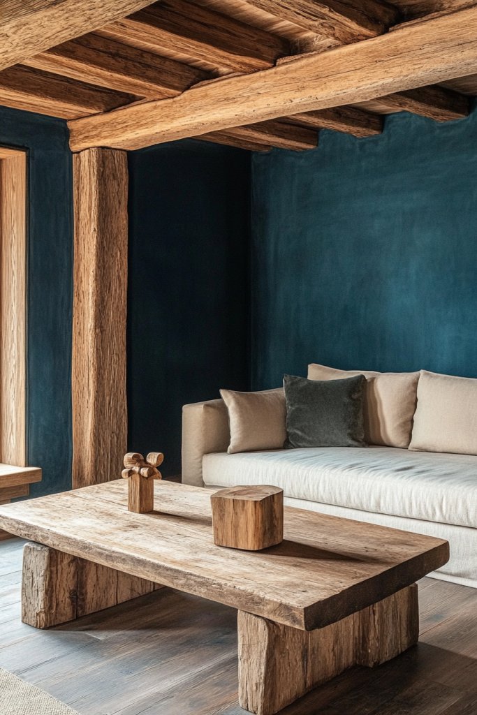 Visualize a living room with peacock blue walls paired with exposed wooden beams and furniture in warm oak or walnut finishes. The blue adds depth and a touch of sophistication, while the wood provides warmth and authenticity. Soft textiles in neutral shades soften the look, and natural light enhances the textured surfaces. The overall effect is a cozy, inviting space that feels both modern and timeless.