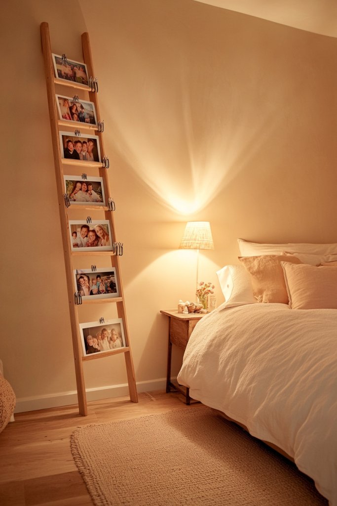 Picture a sleek wooden or metal ladder leaning against your wall, with photos clipped or hung along the rungs. The images cascade vertically, creating a dynamic, eye-catching feature. The rungs can hold a mix of family portraits, travel snaps, or milestone pictures, arranged in a casual yet intentional way. The open structure adds airiness, making the room feel taller and more spacious.