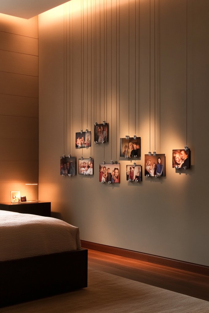 Want a display that’s simple to update and adds a modern touch? A vertical string or cable system with clips gives you a sleek, minimalistic way to showcase your latest family memories. It’s perfect if you love changing things up or want an organized way to keep your photos fresh. Who said wall art has to be permanent?