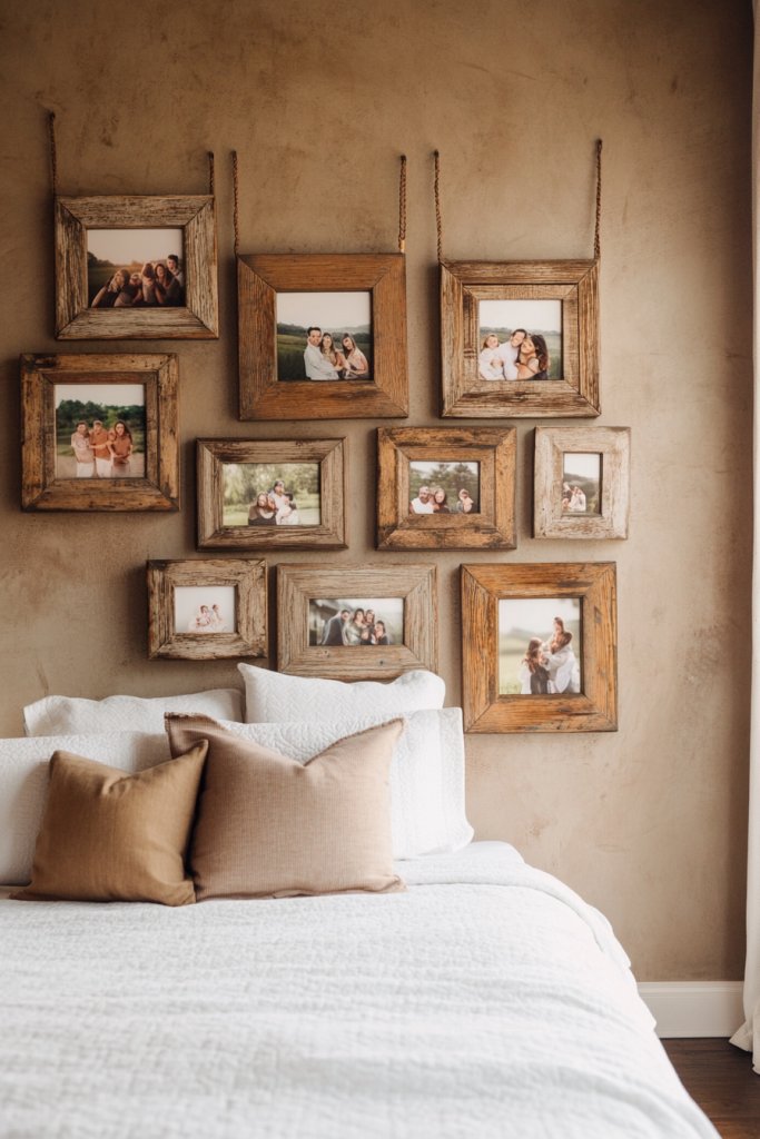 Looking to add warmth and a touch of nostalgia to your bedroom? A rustic wooden frame collage can instantly create that cozy, farmhouse vibe you’re after. It’s perfect if you want your space to feel inviting and personal, like a warm hug from family memories. Ready to transform your walls into a charming storybook?