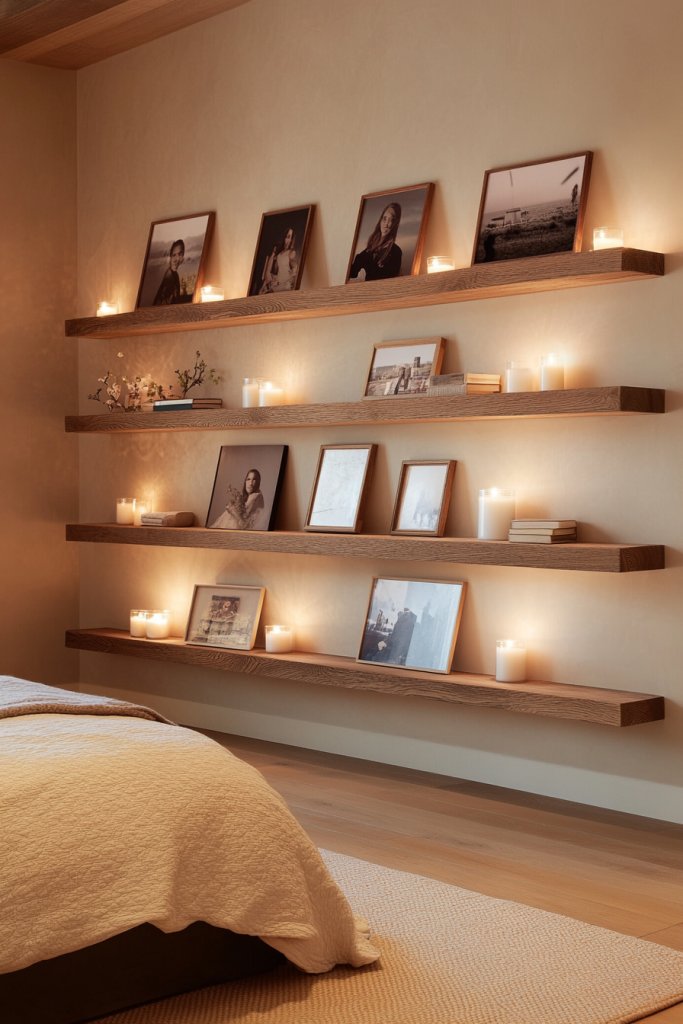 Adjust shelf heights and spacing to suit your room size and style—more spaced out for a breezy look or tightly grouped for intimacy. Swap out photos or add small decorative objects like sculptures or books to keep the arrangement fresh. You can also incorporate seasonal decor or themed accessories to reflect holidays or celebrations. This style adapts well to both small bedrooms and larger spaces.