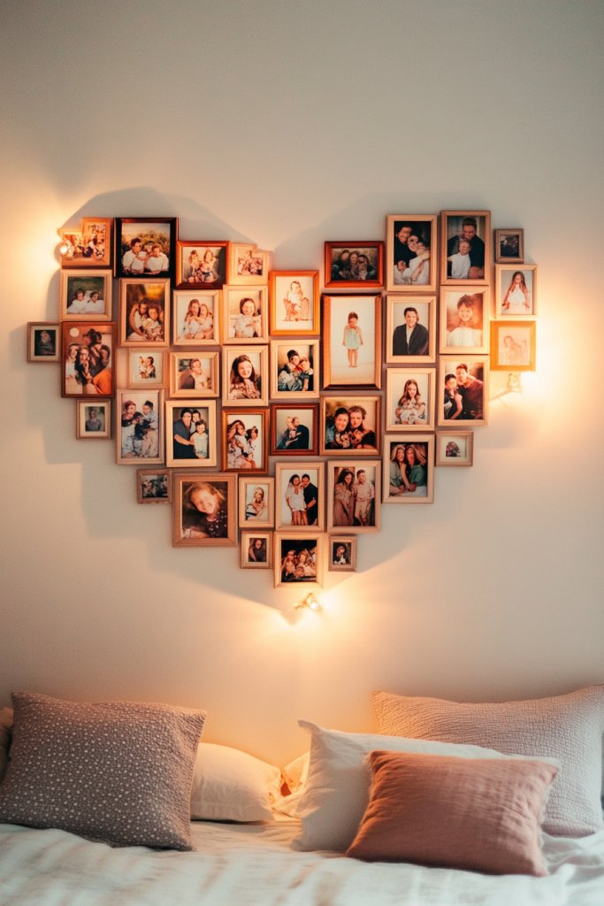 A heart-shaped photo display beautifully captures your love story and family bonds. It creates a cozy, intimate space that feels both personal and decorative. Once you see it come together, you’ll feel inspired to craft other themed shapes or displays. It’s a heartfelt way to turn your walls into a celebration of love.