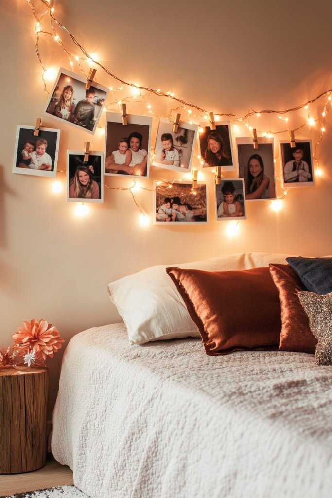 Looking for an easy, budget-friendly way to showcase your family moments? String lights combined with clothespins create a charming, whimsical display that’s simple to set up. It’s perfect for adding a cozy, personalized touch without the fuss of frames and nails. Who knew decorating could be this fun?