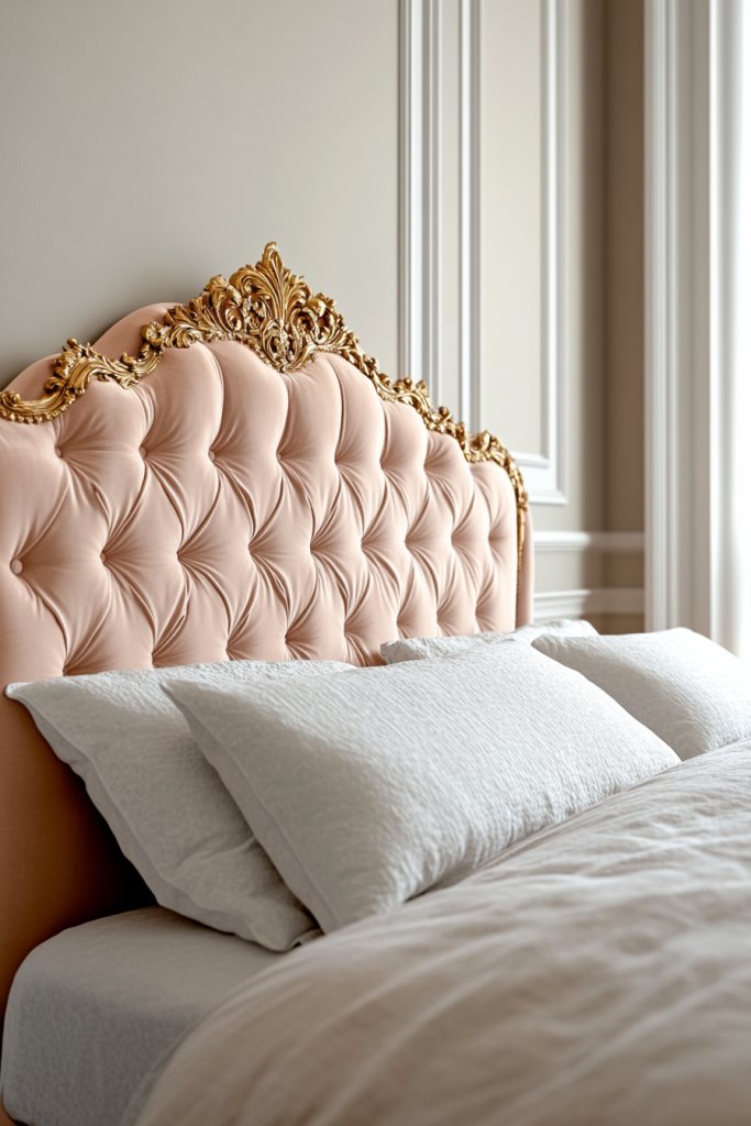 You can customize this look to match different styles—go for a more muted blush for a subtle elegance or a brighter tone for a playful touch. Gold detailing can be minimalist or ornate, depending on your taste. If your room is small, opt for a headboard with a simple design; larger rooms can handle more elaborate patterns or tufted textures. Seasonal updates might include adding plush throws or layered bedding that complements the headboard’s richness.
