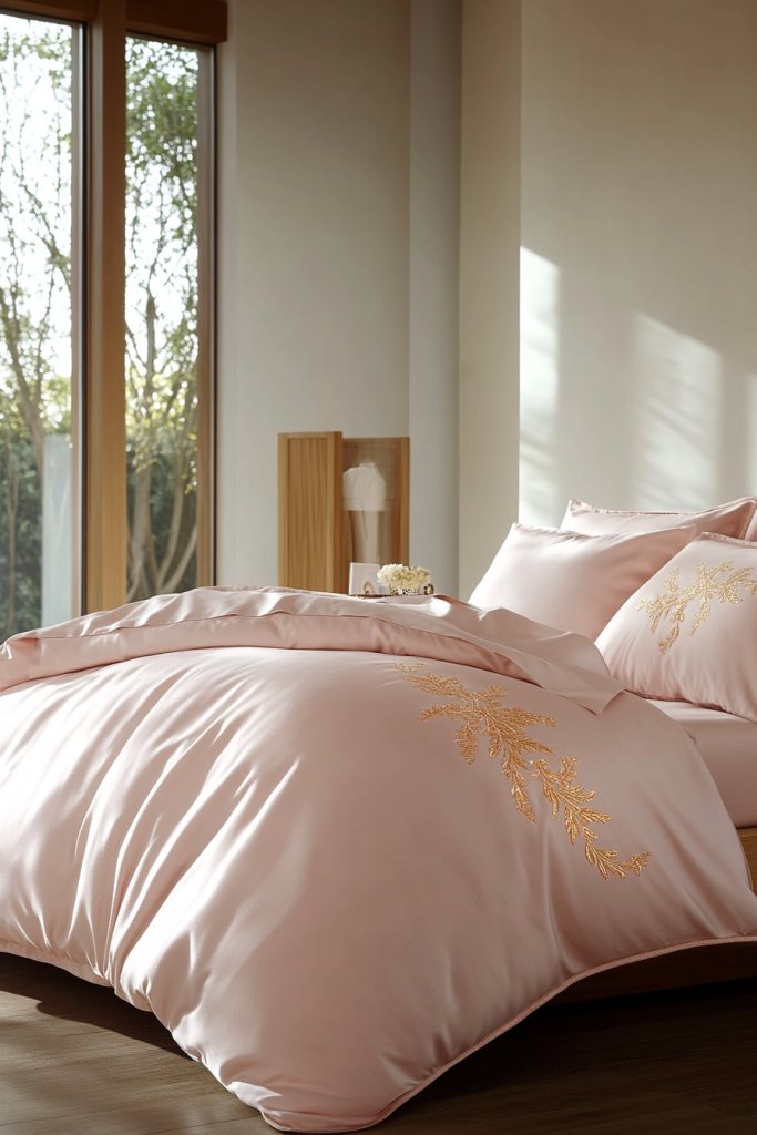 Pink bedding with gold embroidery transforms your bed into a centerpiece of elegance. It reflects your eye for detail and love of luxe touches. Once you see the plush fabrics and shimmering details, you’ll feel more confident in creating a sophisticated space. It’s a simple upgrade that makes your bedroom feel like a five-star retreat.