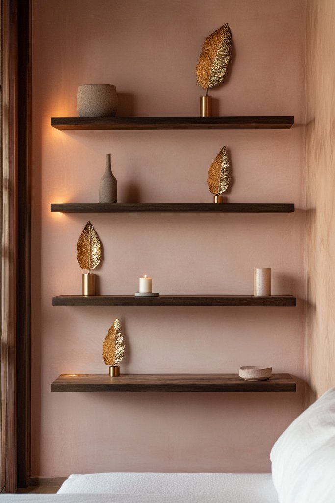 Picture open shelves decorated with small gold leaf objects—sculptures, ornate trays, or picture frames. These accents catch the light and add shimmer, making your shelves stand out. Mix these pieces with pink ceramics or textured items for contrast. The gold leaf details add sophistication, while the curated arrangement creates visual interest. It’s a subtle way to inject personality into your room.