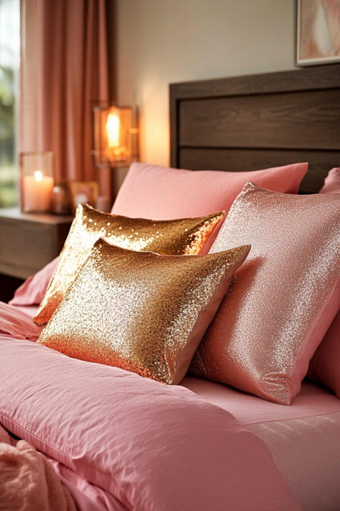 Imagine a bed adorned with various pillows—some in soft pink velvet, others in shiny gold metallic fabric. The different textures catch the light and add visual interest. Mix sizes and shapes—plush squares, slender bolsters, and decorative rounds—for a rich, inviting feel. The gold accents shimmer subtly against the pink, creating a luxurious, layered look that invites you to relax.