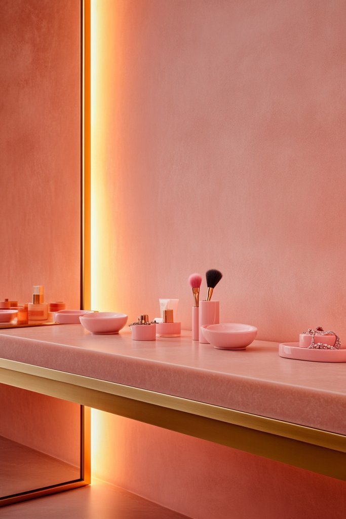 Pick a sturdy gold-framed mirror or a vanity with a gold finish. Organize your beauty essentials in matching pink or gold containers to keep clutter at bay. Add a cushioned pink stool or chair that complements the vanity’s style. Keep the surface clean and organized, with daily tidying to preserve the look. Incorporate lighting—like LED strips or small sconces—if possible, to enhance functionality.
