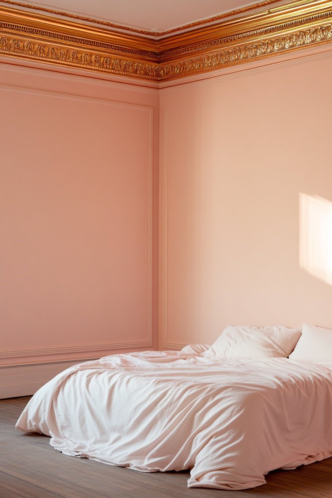 Imagine walls painted in a gentle pink hue that soothes the eye. Accentuated with ornate gold crown molding along the ceiling, the room instantly feels regal. The molding catches light and adds architectural interest, framing the space beautifully. The soft pink walls serve as a perfect canvas for other decor accents—think plush bedding, textured curtains, or metallic accessories. It’s a look that’s both classic and fresh.