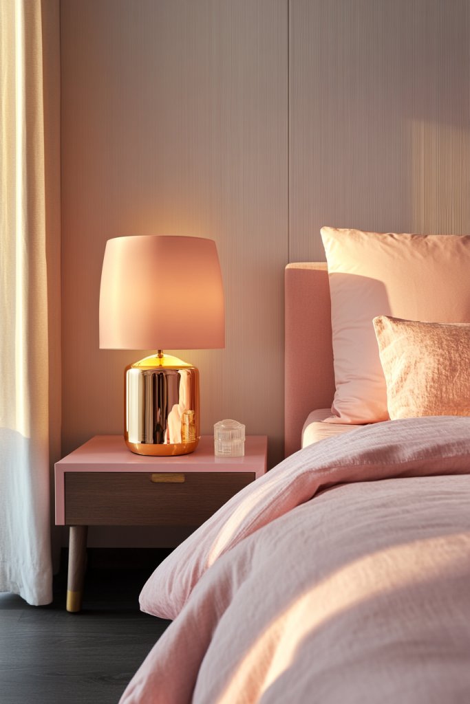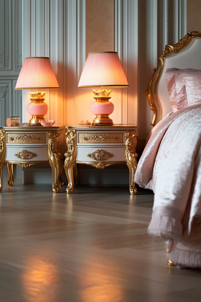 Imagine sleek gold nightstands with a matte or shiny finish, topped with soft pink lamps that glow warmly at night. The contrast of gold and pink creates a balanced look—feminine yet chic. The lamps’ shades diffuse soft light, casting a cozy ambiance around the bed. Subtle decorative objects like books or jewelry trays can rest on the surface, completing the scene. This pairing turns your bedside into a mini oasis of style.