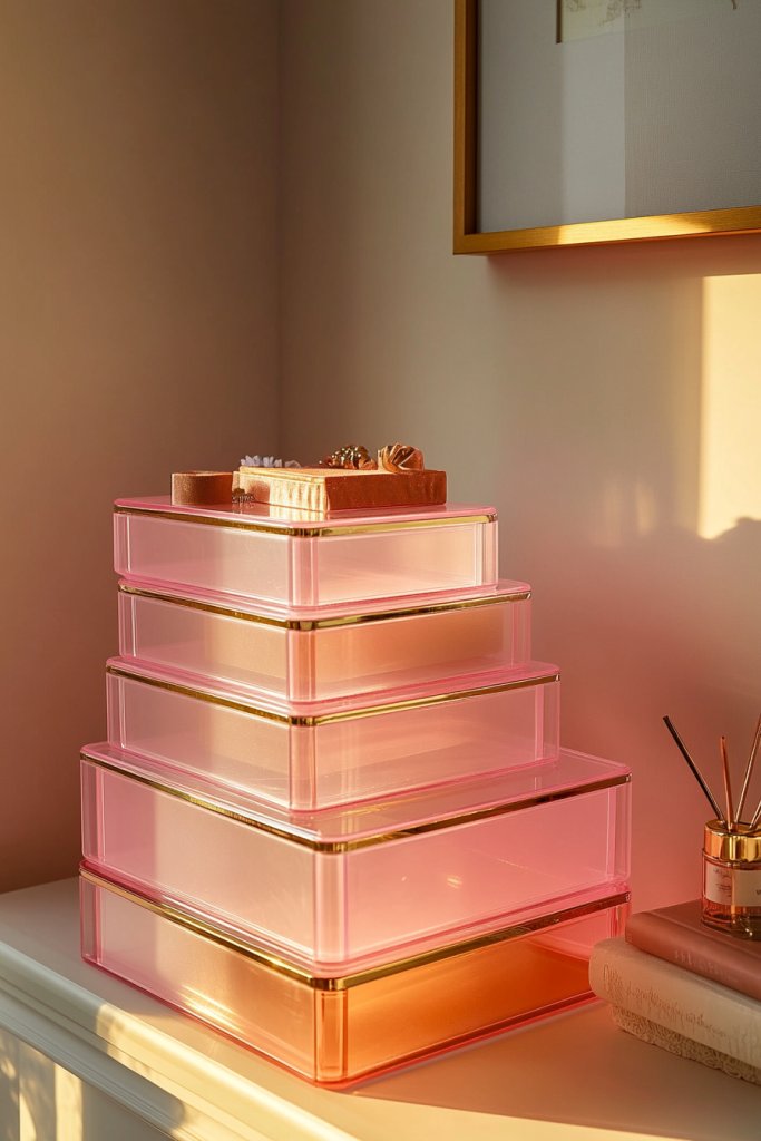 Let’s be honest: clutter is the enemy of style, and no matter how gorgeous your pink and gold theme is, chaos can ruin the vibe faster than you can say “organization.” Enter pink and gold acrylic storage boxes — the sleek, chic way to keep your space tidy while adding a dash of glam. These boxes aren’t just practical; they’re like jewelry boxes for your everyday essentials, turning mess into masterpiece with minimal effort. Who knew organization could look this good?