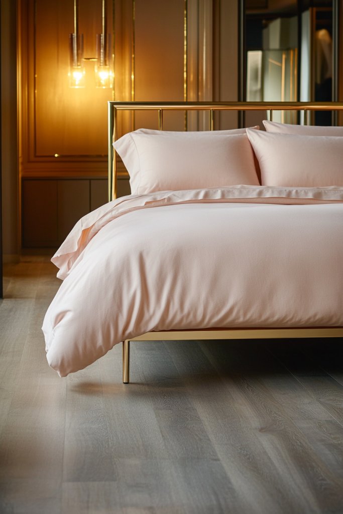 Picture a clean-lined gold metal bed frame, shiny and modern, anchoring the room. The bedding is plush and inviting—crisp pink sheets, a silky duvet, and a few textured pillows. The contrast between the warm gold and gentle pink creates a delicate harmony. Soft lighting reflects off the metallic finish, highlighting the bed as the room’s centerpiece. It’s a look that’s both fresh and timeless.