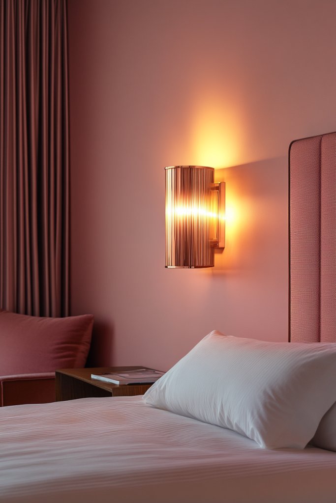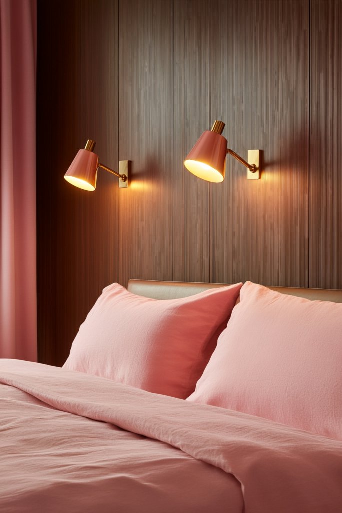 Picture wall-mounted sconces with sleek gold finishes, casting a soft, warm light across blush pink walls. The shades could be fabric or frosted glass, diffusing light gently for a cozy atmosphere. The gold accents catch the light, creating a subtle shimmer that adds luxury to the room. The wall sconces frame the bed beautifully, highlighting the room’s elegant color palette. Their placement offers balanced illumination, making the space feel more intimate and inviting. It’s like having a personal spa vibe every night.