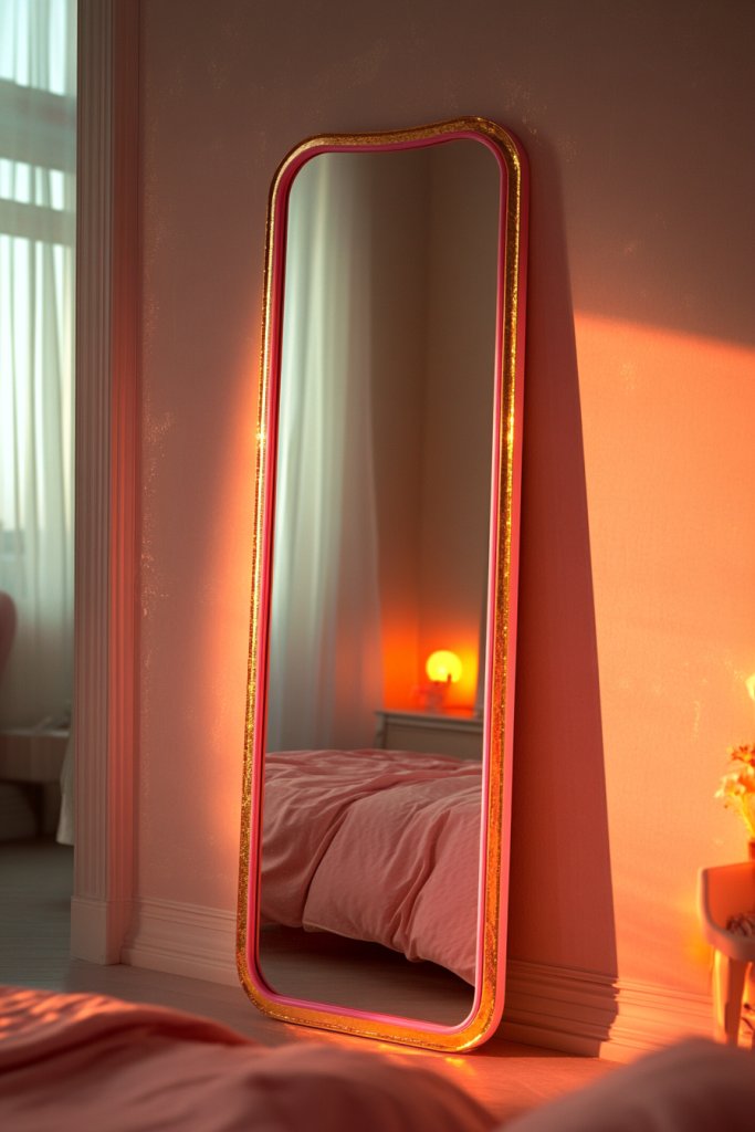 Picture a tall, full-length mirror with a delicate pink border and gold accents along the edges. It leans against the wall or is mounted for a sleek look. The pink frame softens the gold detailing, creating a playful yet refined vibe. When you look into it, the room feels more spacious, and the light bounces around beautifully. It becomes a statement piece that doubles as wall art.