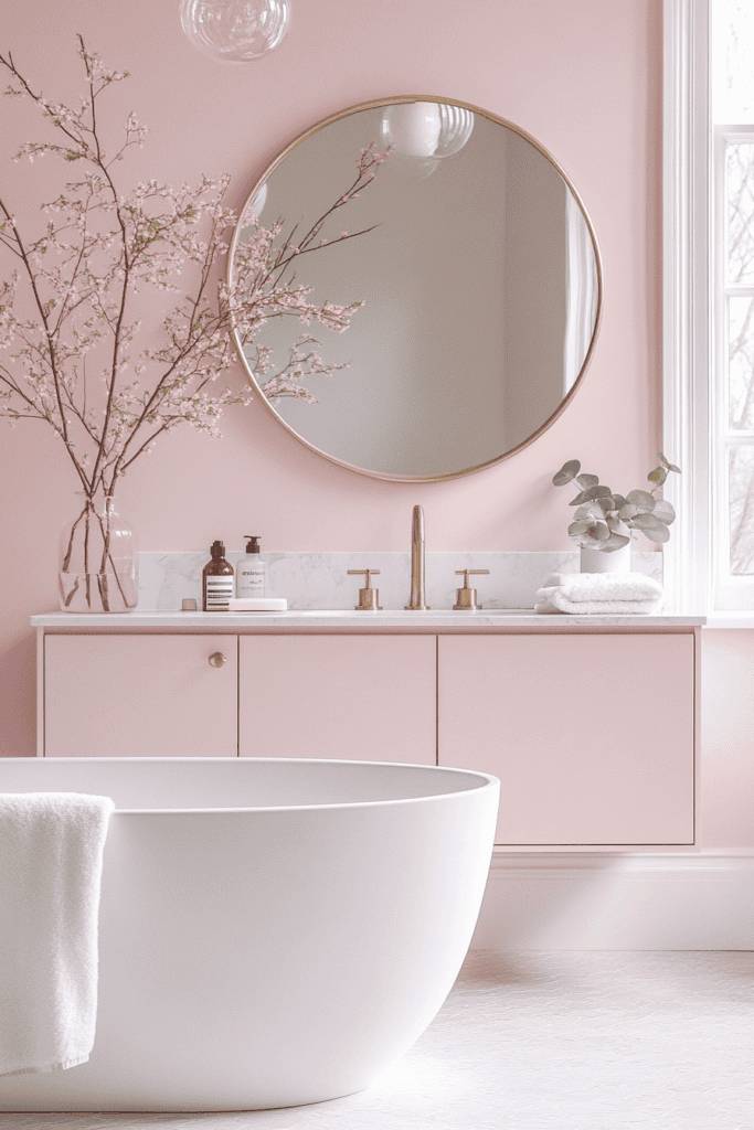 A soft blush pink wall combined with gold fixtures creates a luxurious and tranquil bathroom space. The round mirror with a gold frame perfectly complements the pink vanity, adding elegance and refinement. A freestanding white tub against the pastel backdrop keeps the room airy and sophisticated. Incorporate natural elements like a vase of flowering branches or eucalyptus to complete this serene look.