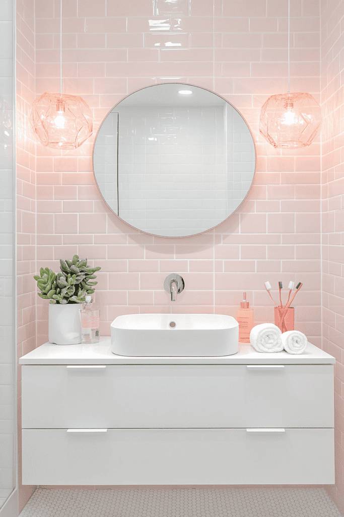 For a clean and fresh aesthetic, opt for light pink subway tiles paired with white fixtures. Modern geometric lighting in a soft rose gold hue adds an artistic touch to the space. Complement this look with minimalistic decor, like a potted succulent and sleek accessories, for a streamlined and serene bathroom.