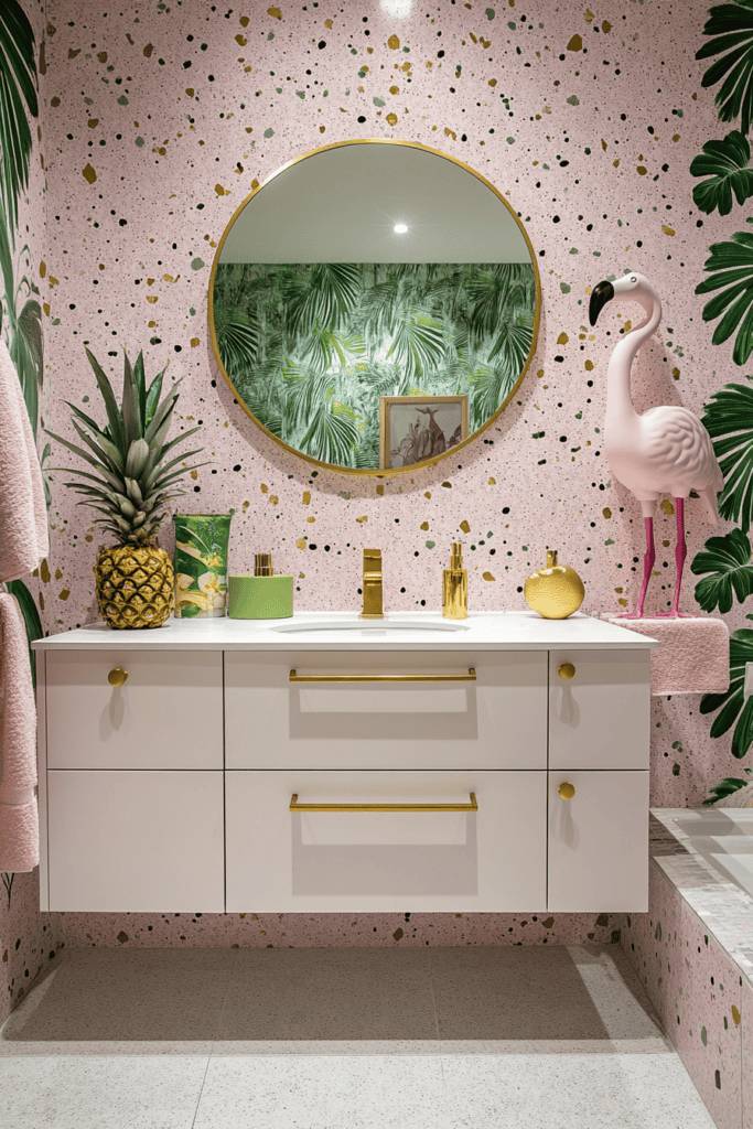 Create a fun and vibrant bathroom with pink terrazzo walls featuring multicolored speckles. Add tropical wallpaper or real plants for a lush, jungle-like vibe. Incorporate gold accents like faucets and drawer handles to tie the look together, and include playful decor, such as a flamingo statue, to make the space feel unique and lively.