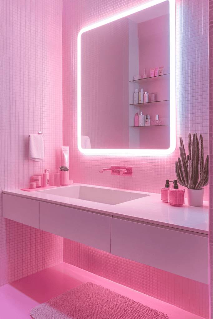 Embrace a modern and futuristic aesthetic with neon pink lighting framing a mirror. Pair this bold feature with sleek, glossy pink tiles and minimalistic white vanities. Add a few small plants for a refreshing pop of green to balance the striking pink tones and create a contemporary, spa-like atmosphere.