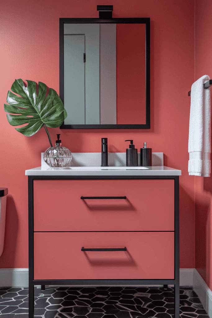 For a striking and daring look, opt for coral pink walls paired with black accents. A black-framed mirror, faucets, and vanity handles provide dramatic contrast, while geometric black-and-white flooring enhances the modern vibe. Add a tropical plant for a hint of softness and natural texture.