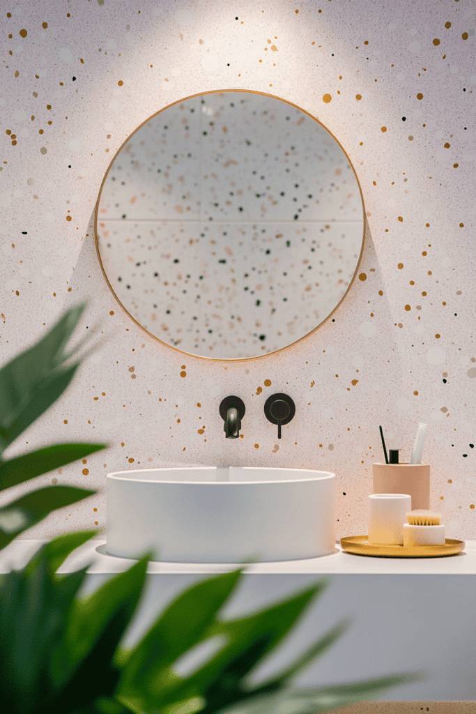 Speckled pink walls with gold accents create a chic yet playful backdrop. Opt for a round mirror with a gold frame and minimalist fixtures for a refined look. Keep the decor simple with a small tray of essentials and fresh greenery to ensure the wall remains the centerpiece of the design.