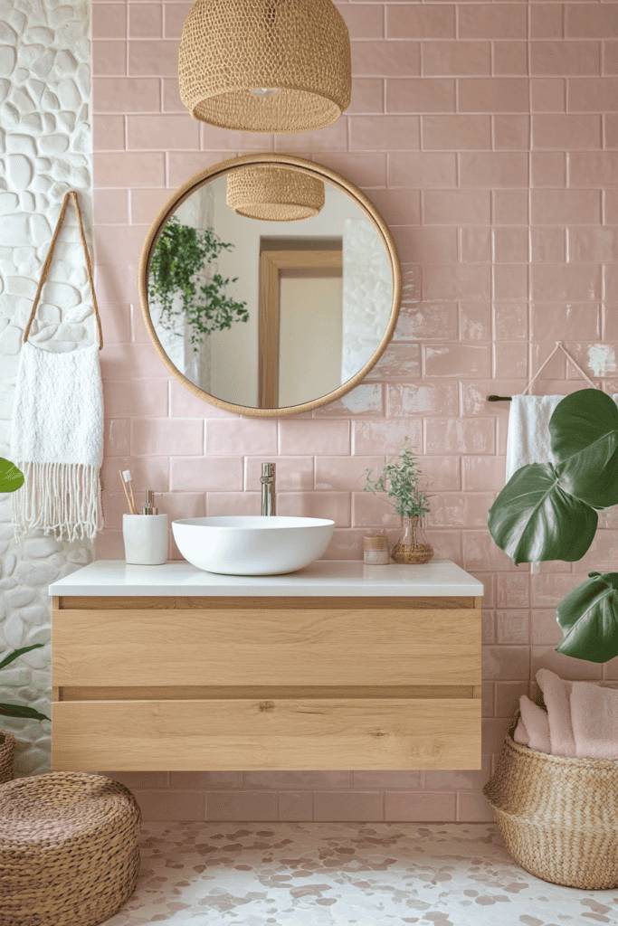 Pink glossy tiles paired with earthy tones and natural textures bring warmth and personality to a bathroom. The rattan mirror frame and matching pendant light contrast beautifully with the light pink wall tiles, creating a cozy and inviting vibe. A wooden vanity and woven baskets add an organic touch, blending modern minimalism with rustic charm.