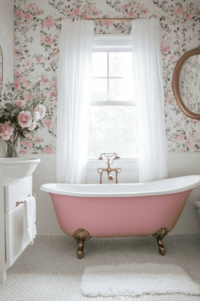4. Vintage Pink Bathtub with Floral Wallpaper