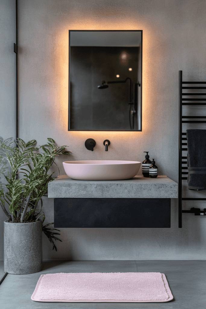 Combine industrial design elements with a pop of pink for a bold and modern bathroom. A concrete countertop and black fixtures serve as a striking contrast to the soft pink basin, creating an edgy yet sophisticated vibe. Enhance the space with subtle pink accents like a textured bath mat or fresh greenery to balance the look.